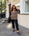Теплий вільний спортивний костюм у стилі oversize, виготовлений з м’якого еко-баранчика на флісі та комбінований чорною ХБ стрейч триниткою. Матеріал дуже приємний до тіла, добре тягнеться, зберігає тепло і забезпечує комфорт навіть у холодну пору року. Костюм має якісне пошиття, ідеальну посадку та сучасний вигляд. Кофта-худі з капюшоном на змійці доповнена куліскою по низу, що дозволяє регулювати довжину. Штани з високою посадкою на гумці мають зручні кишені у бокових швах. Стильний і практичний варіант для прогулянок, відпочинку та повсякденного носіння. На моделях представлений розмір 50-52.