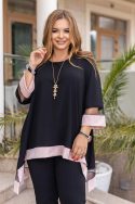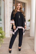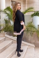 Додаткові характеристики: Костюм жіночий двопредметний, що складається з туніки та штанів. Туніка А-силуету із втачним рукавом. Низ туніки фігурної форми з подовженням на спину. По низу спинки туніки та рукавів вставка з сітки та паєтки. Костюм – це бездоганний вибір сучасної модниці.