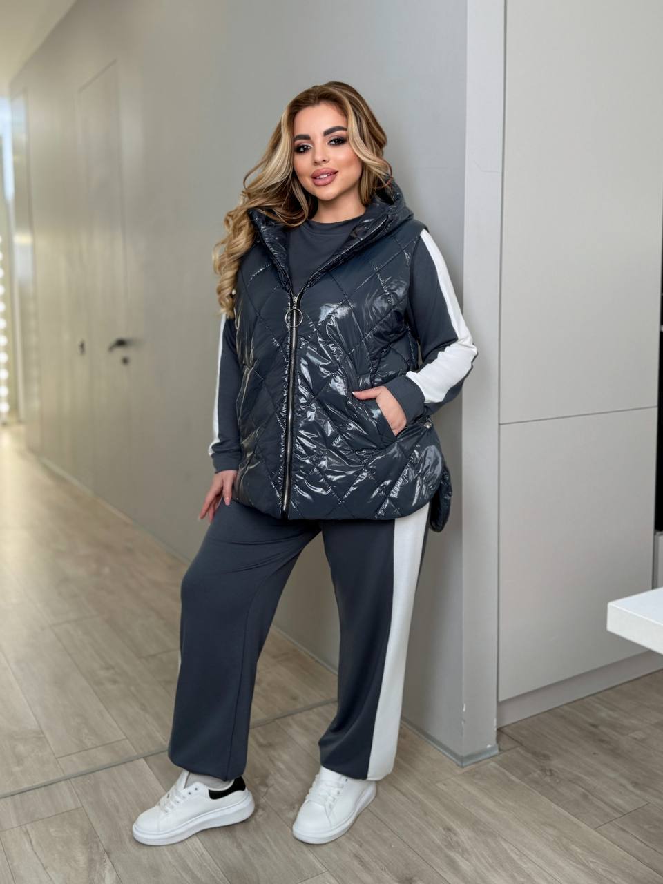 Трійка – комплект, що включає жилет, брюки та кофту, створений для комфорту та стилю в будь-яких умовах. Матеріал виконаний із плащівки «Монклер», стьобаної на синтепоні щільністю 100, а костюм — із двохнитки високої якості, що забезпечує довговічність та приємні тактильні відчуття. Жилет із підкладкою і наповнювачем із синтепону додає тепла навіть у прохолодну погоду. Комплект оснащений зручними і стильними кишенями та якісною фурнітурою, що робить його практичним і функціональним. Ідеальний варіант для повсякденного носіння, прогулянок та активного відпочинку.