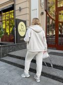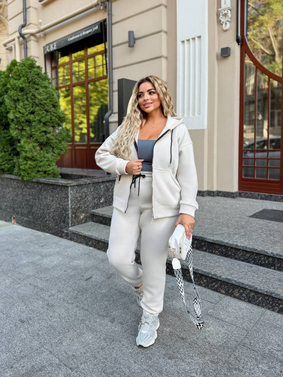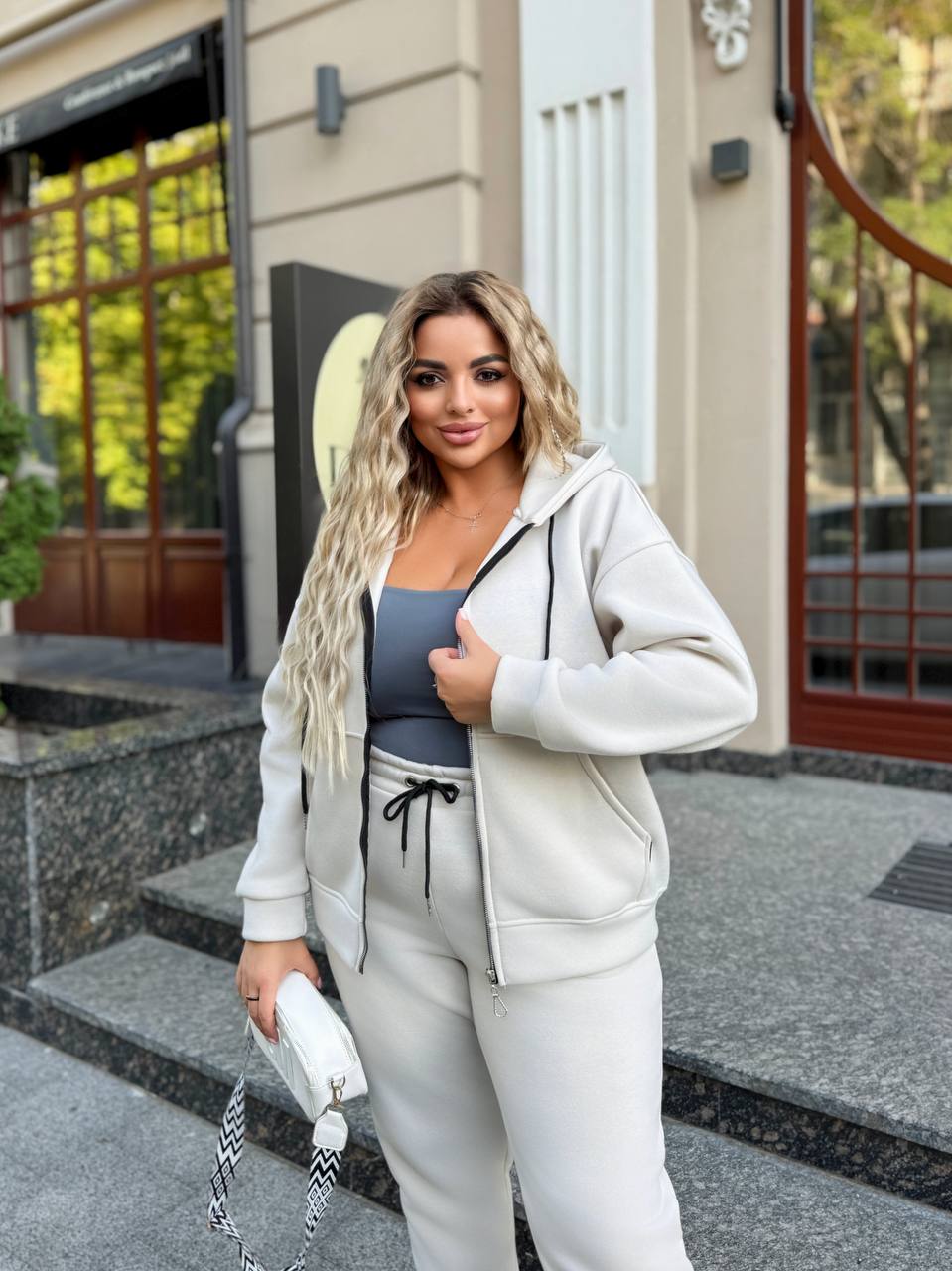 Теплий спортивний костюм із стрейч тринитки на флісі — м’який, комфортний і з гарною розтяжністю. Якісне пошиття з надійної тканини забезпечує ідеальну посадку та стильний вигляд. Худі з подвійним капюшоном на змійці доповнене модними перестрочками, що надають образу сучасності. Штани з високою посадкою на гумці та кишенями у бокових швах дарують зручність у повсякденному носінні. Ідеальний вибір для холодної пори року. На моделях представлений розмір 50–52.