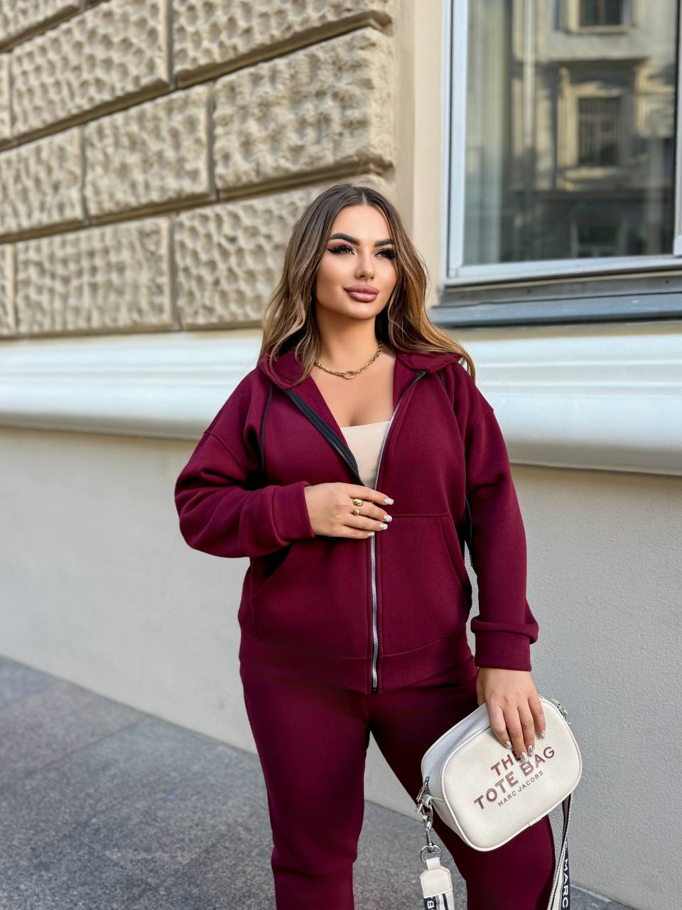 Теплий спортивний костюм із стрейч тринитки на флісі — м’який, комфортний і з гарною розтяжністю. Якісне пошиття з надійної тканини забезпечує ідеальну посадку та стильний вигляд. Худі з подвійним капюшоном на змійці доповнене модними перестрочками, що надають образу сучасності. Штани з високою посадкою на гумці та кишенями у бокових швах дарують зручність у повсякденному носінні. Ідеальний вибір для холодної пори року. На моделях представлений розмір 50–52.
