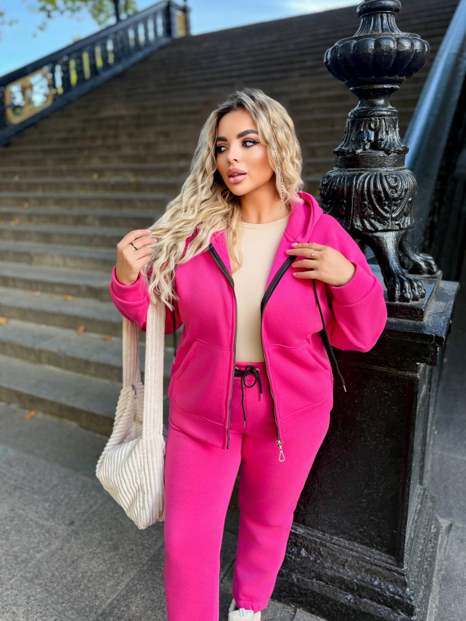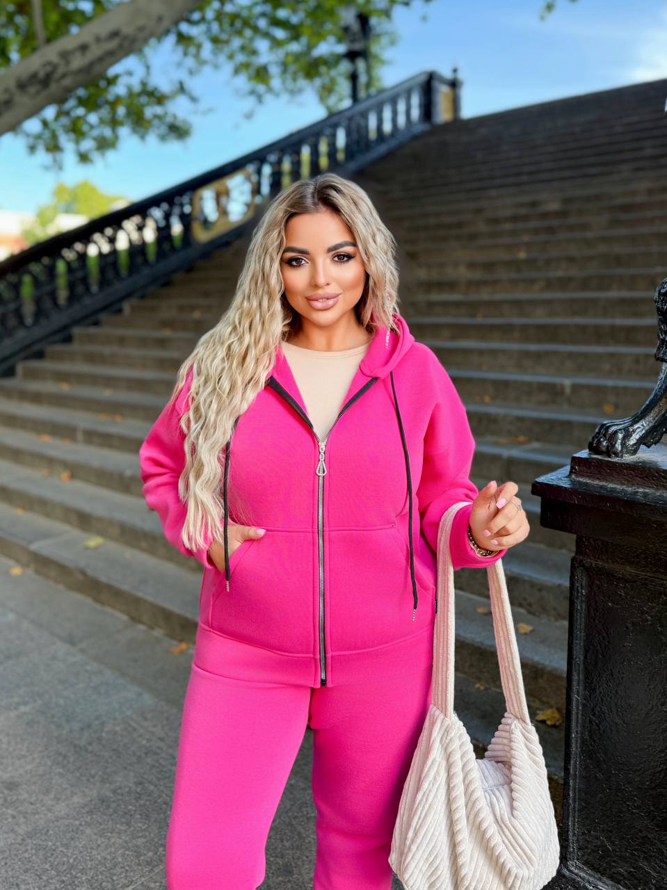 Теплий спортивний костюм із стрейч тринитки на флісі — м’який, комфортний і з гарною розтяжністю. Якісне пошиття з надійної тканини забезпечує ідеальну посадку та стильний вигляд. Худі з подвійним капюшоном на змійці доповнене модними перестрочками, що надають образу сучасності. Штани з високою посадкою на гумці та кишенями у бокових швах дарують зручність у повсякденному носінні. Ідеальний вибір для холодної пори року. На моделях представлений розмір 50–52.