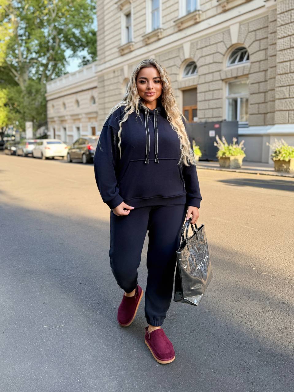 Якісно пошитий спортивний костюм з м’якої та приємної на дотик тканини, що має ідеальну посадку та сучасний вигляд. Теплий і комфортний варіант на холодну пору року. Кофта-худі з подвійним капюшоном дарує додатковий захист від вітру та холоду. Штани з високою посадкою на зручній гумці та кишенями у бокових швах забезпечують комфорт і практичність. М’який теплий фліс з гарною розтяжністю створює відчуття затишку й свободи рухів. На моделях представлений розмір 50-52.