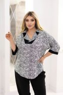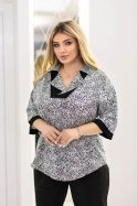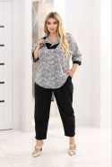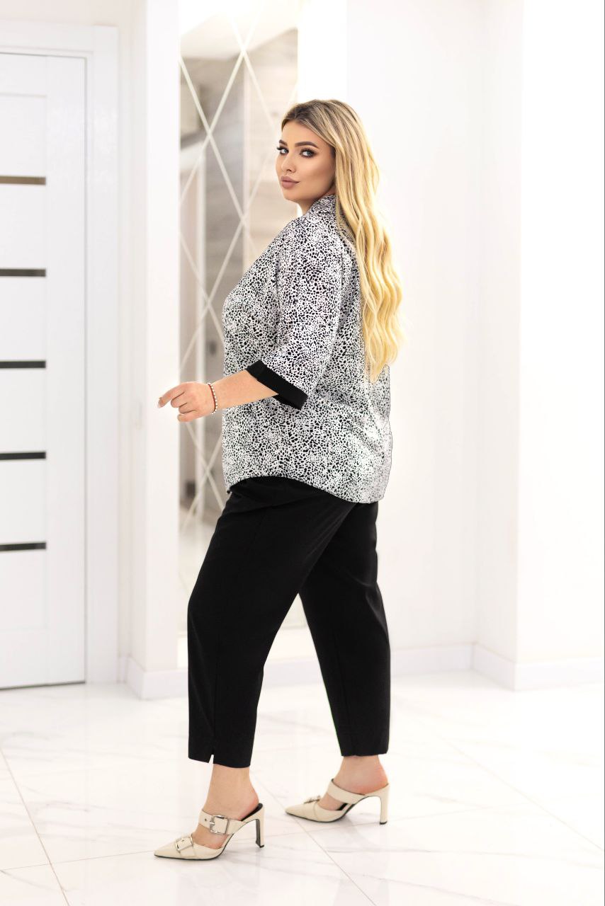 Додаткові характеристики: Чудовий костюм який надасть вам свіжості, жіночності та гарного настрою на весь день. Блуза вільна, з гарним комірцем. Пояс штанів спереду прямий по ззаду на резинці, спереду ідуть складки для вільності штанів, посадка штанів середня, зручний шов сидіння, пояс на резинці – прострочений на спеціальному обладнанні для хорошої фіксації. Штани мають кишені , а також по низу мають розрізи. Зріст моделі на фото – 170 см, на моделі одягнений розмір 52-54. Параметри моделі на момент зйомки: Охват грудей – 110 см, охват талії – 89 см, охват стегон – 118 см.