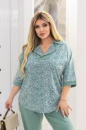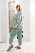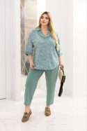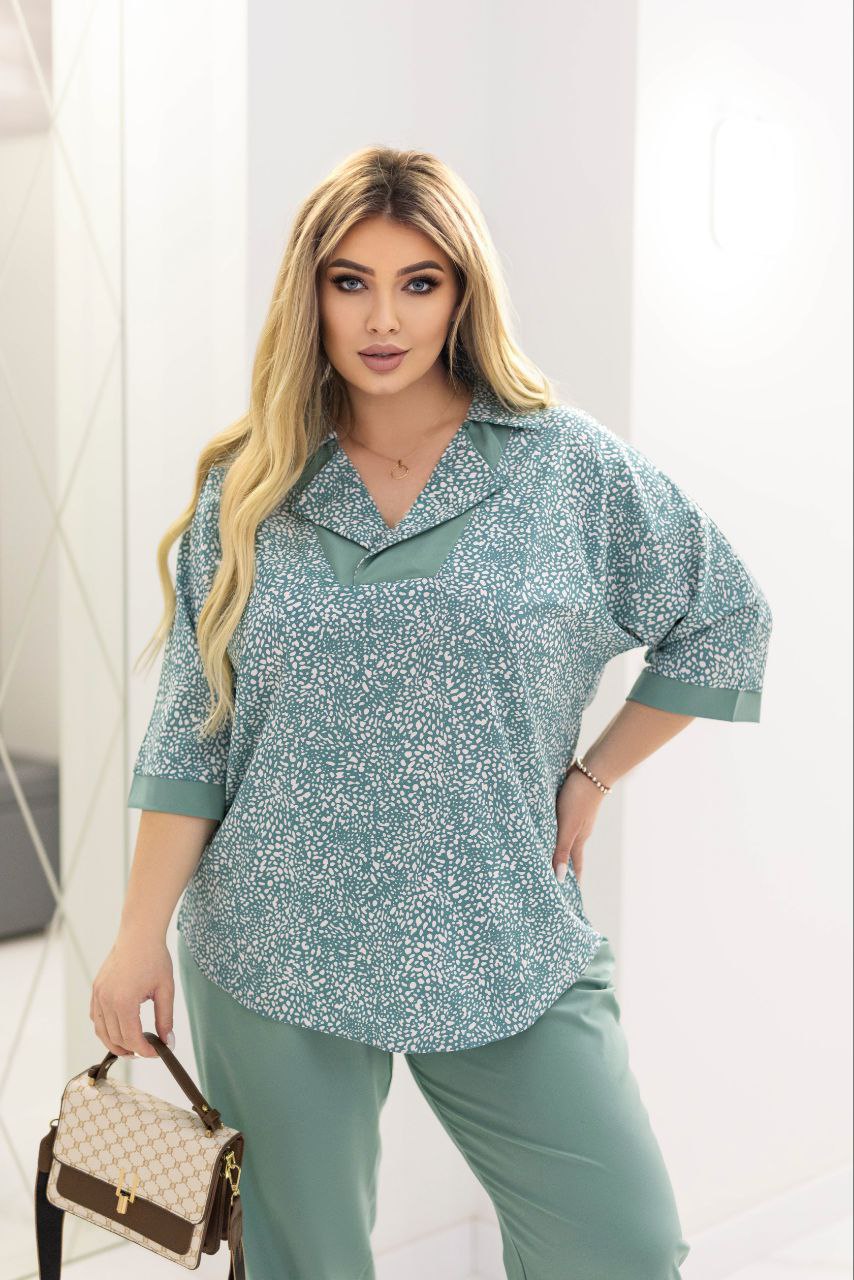 Додаткові характеристики: Чудовий костюм який надасть вам свіжості, жіночності та гарного настрою на весь день. Блуза вільна, з гарним комірцем. Пояс штанів спереду прямий по ззаду на резинці, спереду ідуть складки для вільності штанів, посадка штанів середня, зручний шов сидіння, пояс на резинці – прострочений на спеціальному обладнанні для хорошої фіксації. Штани мають кишені , а також по низу мають розрізи. Зріст моделі на фото – 170 см, на моделі одягнений розмір 52-54. Параметри моделі на момент зйомки: Охват грудей – 110 см, охват талії – 89 см, охват стегон – 118 см.
