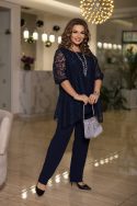 Додаткові характеристики: Ефектний комплект, в якому поєднується краса та якість. Комплектація з блузи та штанів. Ошатна блузка напівприлеглого силуету з тканини з легким елегантним мерехтінням. На поличці нагрудні виточки, виріз горловини акуратної округлої форми. Рукав втачний, вільний, низ прилаштований. Штани злегка звужені донизу. Пояс на резинці. У Вас не буде шансів залишитись непоміченою! На моделі розмір 50-52 Параметри моделі: Обхват грудей – 110 см Обхват стегон – 114 см