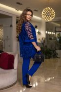 Додаткові характеристики: Комплект двох предметний, складається з блузки та штанів. У такому вбранні жінка виглядатиме елегантно, святково на будь-якій події. Блузка напівприлеглого силуету виготовлена з флока на сітці. Горловина округлої форми. Полиця з нагрудними виточками. Рукав втічний, вільний 3/4. Штани злегка звужені донизу. Прекрасний вибір для вашого образу, який поєднує в собі красу та зручність. На моделі одягнений: 50-52 розмір. Параметри моделі на момент зйомки: ОГ- 109 см. ОБ- 114 см.