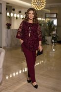 Додаткові характеристики: Комплект двох предметний, складається з блузки та штанів. У такому вбранні жінка виглядатиме елегантно, святково на будь-якій події. Блузка напівприлеглого силуету виготовлена з флока на сітці. Горловина округлої форми. Полиця з нагрудними виточками. Рукав втічний, вільний 3/4. Штани злегка звужені донизу. Прекрасний вибір для вашого образу, який поєднує в собі красу та зручність. На моделі одягнений: 50-52 розмір. Параметри моделі на момент зйомки: ОГ- 109 см. ОБ- 114 см.
