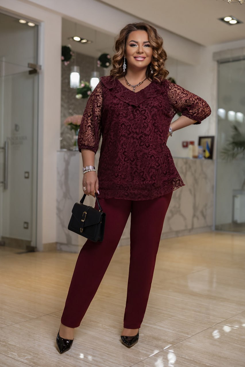 Додаткові характеристики: Вишуканий костюм для справжньої леді, що поєднує в собі елегантність та сучасний стиль. Цей костюм підійде для будь-яких заходів: від офісних буднів до світських виходів. Комплект призначений як для ошатного, так і для повсякденного носіння. . Рукав втачний, вільний 3/4. Штани злегка звужені донизу. Прекрасний вибір для вашого образу, який поєднує в собі красу та зручність. На моделі одягнений: 50-52 розмір. Параметри моделі на момент зйомки: ОГ- 109 см. ОБ- 114 см.