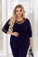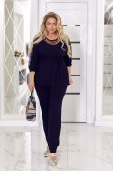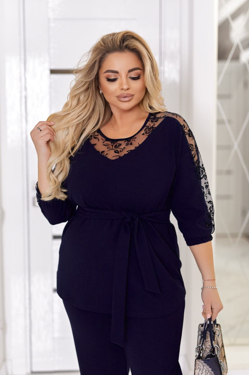 Комплект складається з блузи та штанів. Блуза прямого силуету. Рукава реглан з прозорої тканини з принтом, що красиво поєднується з основною тканиною виробу. Низ рукава оброблений на резинку. Горловина V-подібної форми. У бічних швах розрізи блузки. Перед нагрудними виточками. Штани сідають по фігурі, середня посадка, з кишенями. Відчуйте себе впевненою та стильною у будь-якій ситуації!