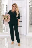 Комплект складається з блузи та штанів. Блуза прямого силуету. Рукава реглан з прозорої тканини з принтом, що красиво поєднується з основною тканиною виробу. Низ рукава оброблений на резинку. Горловина V-подібної форми. У бічних швах розрізи блузки. Перед нагрудними виточками. Штани сідають по фігурі, середня посадка, з кишенями. Відчуйте себе впевненою та стильною у будь-якій ситуації!