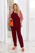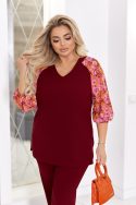 Комплект складається з блузи та штанів. Блуза прямого силуету. Рукава реглан з прозорої тканини з принтом, що контрастно поєднується з основною тканиною виробу. Низ рукава оброблений на резинку. Горловина V-подібної форми. У бічних швах розрізи блузки. Перед нагрудними виточками. Штани сідають по фігурі, середня посадка, з кишенями. Відчуйте себе впевненою та стильною у будь-якій ситуації!