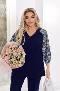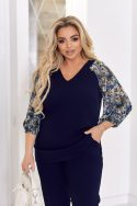 Комплект складається з блузи та штанів. Блуза прямого силуету. Рукава реглан з прозорої тканини з принтом, що контрастно поєднується з основною тканиною виробу. Низ рукава оброблений на резинку. Горловина V-подібної форми. У бічних швах розрізи блузки. Перед нагрудними виточками. Штани сідають по фігурі, середня посадка, з кишенями. Відчуйте себе впевненою та стильною у будь-якій ситуації!