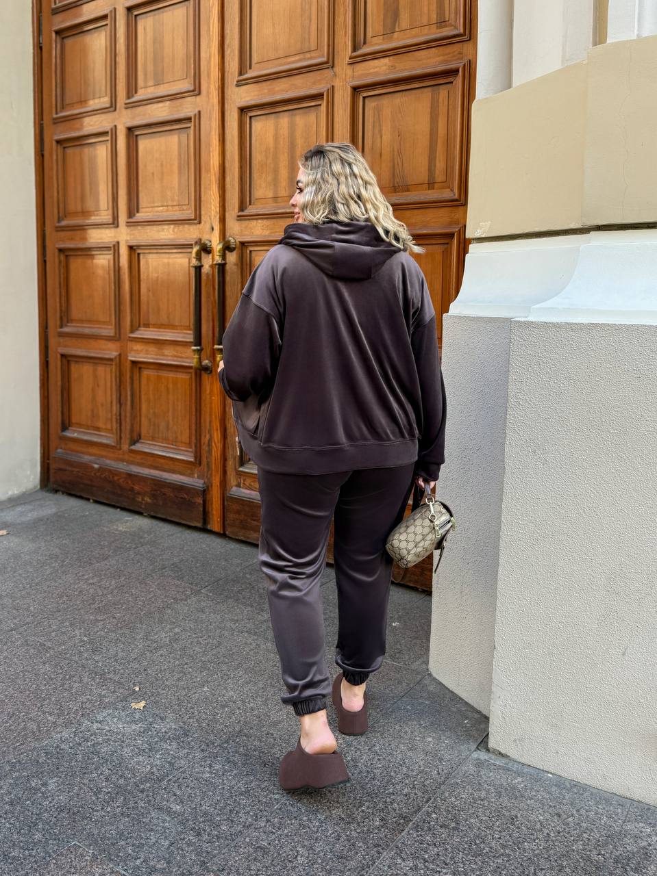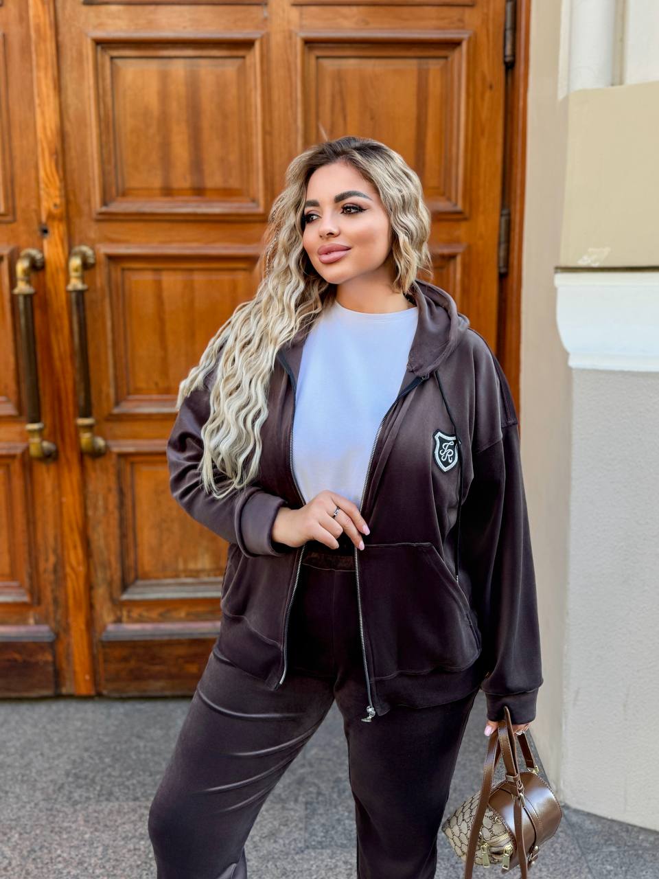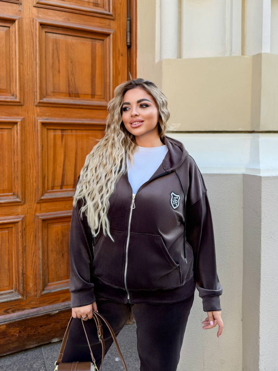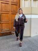 Якісний велюр з доброю розтяжністю — м’який, приємний на дотик та комфортний у носінні. Стильний спортивний костюм із модними перестрочками виглядає сучасно та елегантно. Худі на змійці з подвійним капюшоном додає зручності та захисту від холоду. Штани-джогери з високою посадкою мають зручні кишені у бокових швах, пояс і низ на гумці для ідеальної посадки. Ідеальний вибір для повсякденного стилю та відпочинку. Прання у делікатному режимі за температури 30°С. На моделях представлений розмір 50–52.