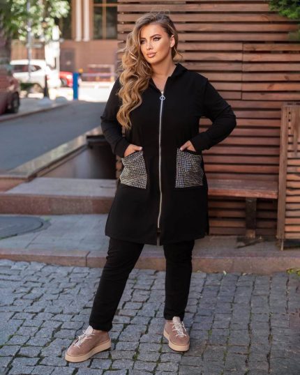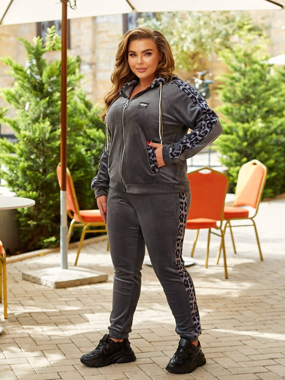 Костюм виконаний із якісної тканини, відмінно носиться та приємний до тіла. Кофта вільного силуету з капюшоном і кишенями-листочками прикрашена стильними вставками з леопарда, рукави завершені манжетами для комфорту. Штани з високою посадкою мають оброблені кишені та манжети по низу. Матеріал — королівський велюр на ХБ основі, що забезпечує м’якість, тепло та довговічність. Вільний крій не обмежує рухів і гарантує максимальний комфорт під час носіння, роблячи костюм ідеальним для повсякденного стилю та відпочинку.