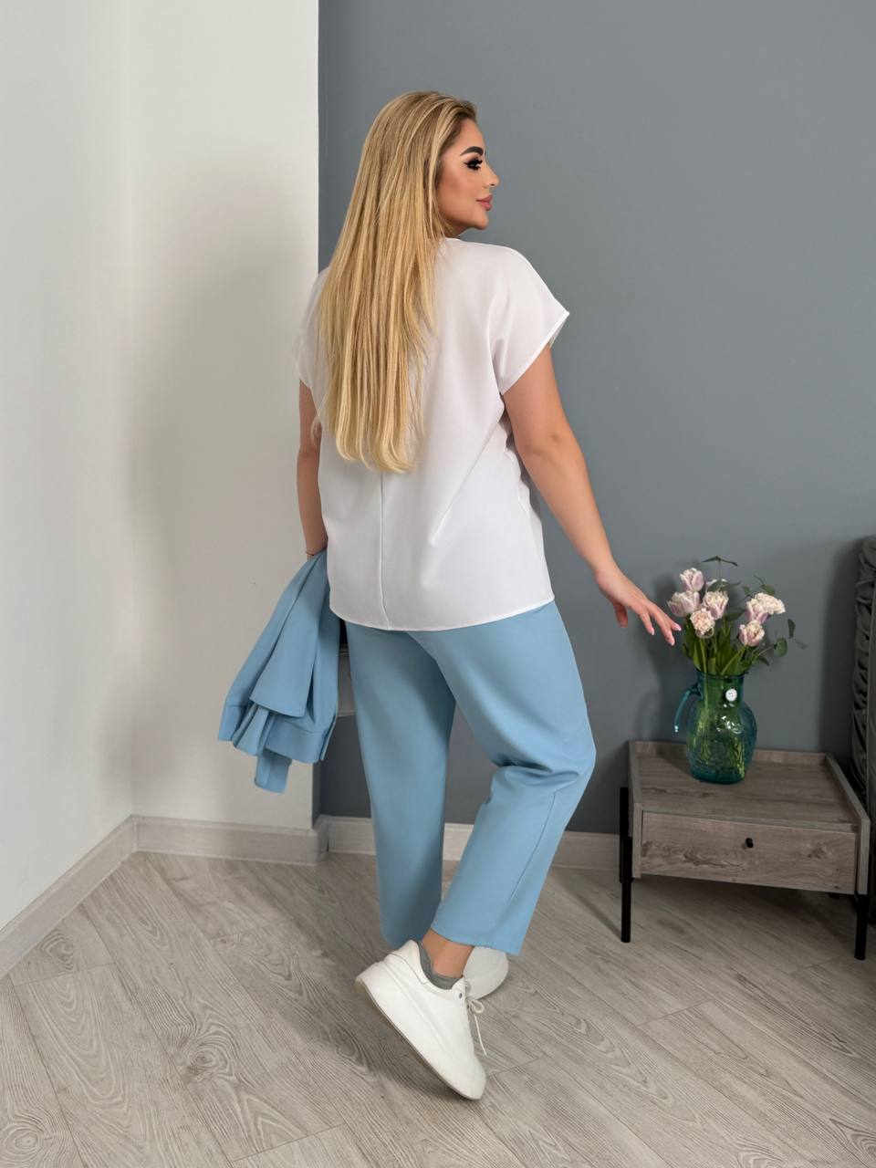Стильний костюм-трійка: штани фасону ‘мом’, оверсайз сорочка та блуза з софту з якісним накатом. Вдале поєднання сучасного крою та комфортних матеріалів, що підійде для повсякденного використання та створення актуального образу.