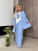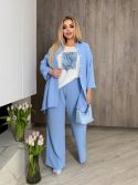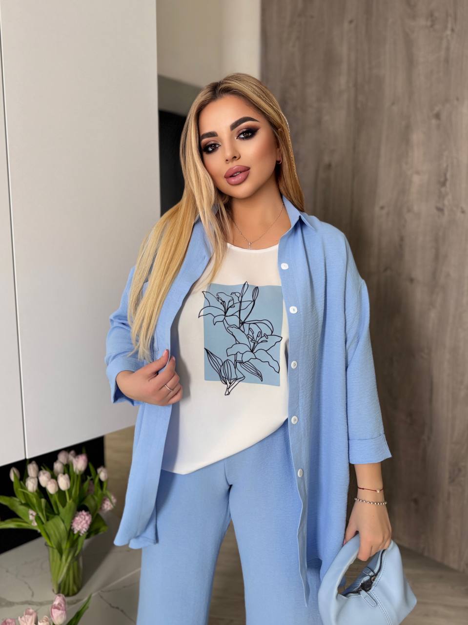 Додаткові характеристики: Сорочка, футболка із якісним принтом та брюки палаццо – легкий і продуманий комплект із трьох елементів. Найзручніший і комфортний одяг. Літо – це час прогулянок, подорожей і нових вражень, а трійка у найніжніших кольорах залишається актуальною як ніколи. Гармонійне поєднання стилю, свободи рухів та природної легкості