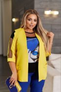 Додаткові характеристики: Сезон: весна, літо, осінь. Сучамний, Комфортний стильний костюм. Піджак без застібки, з кишенями. Футболка по горловині йде із сітки, з переду пришитий принт ” дівчина в капелюсі” + оформлено перлинами. Брюки по низу звужені, довжина 7/8. Посадка висока, зручний шов сидіння, пояс спереді рівний, сзаду на резинці- простроченний на спеціальному обладнанні для хорошої фіксаціі резинки- не буде перекручуватися, з кишенями. На моделі одягнений: 52-54 розмір. Параметри моделі на момент зйомки: ОГ: 115 см. ОБ: 120 см.