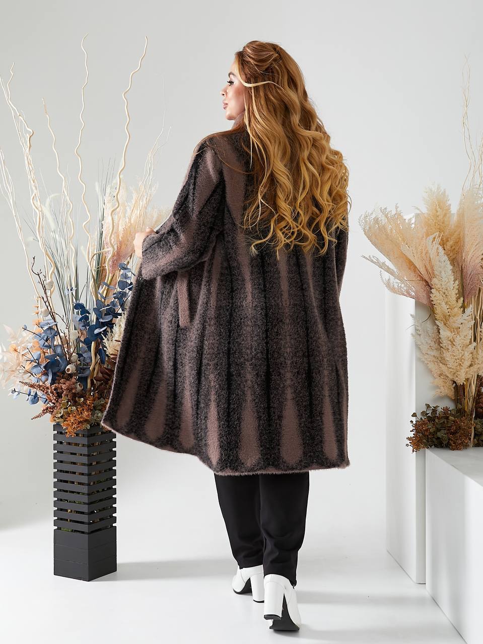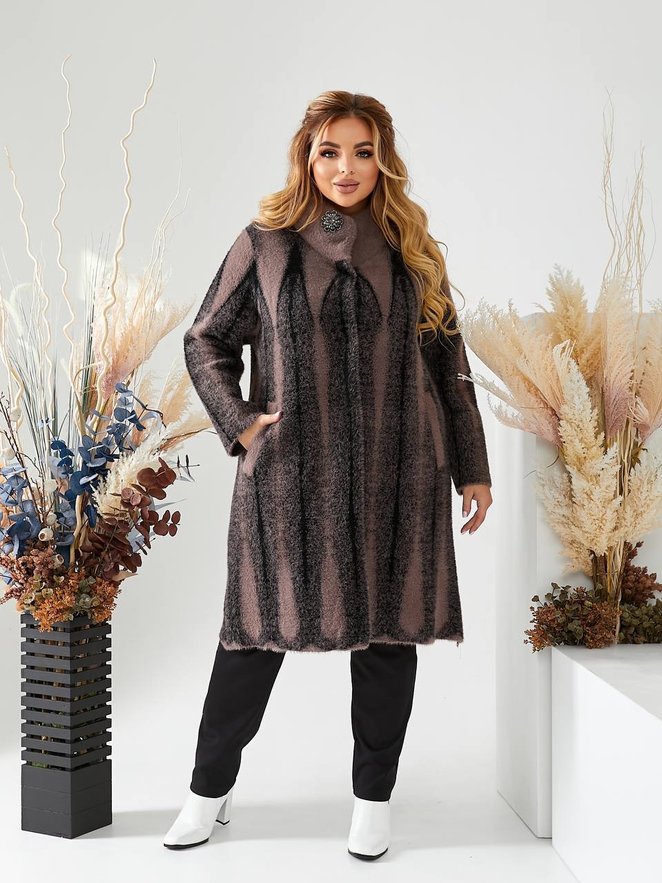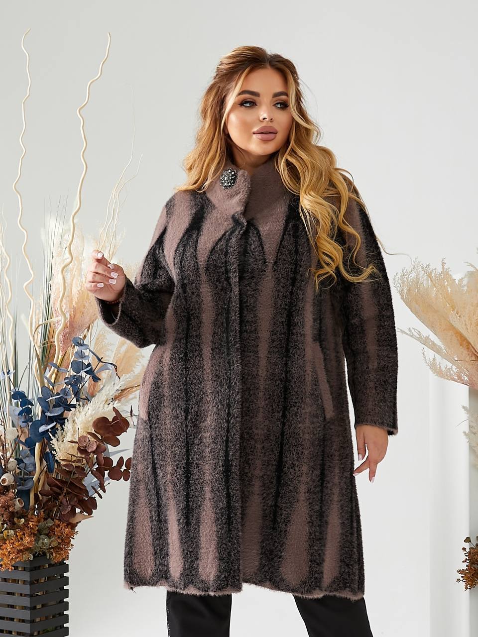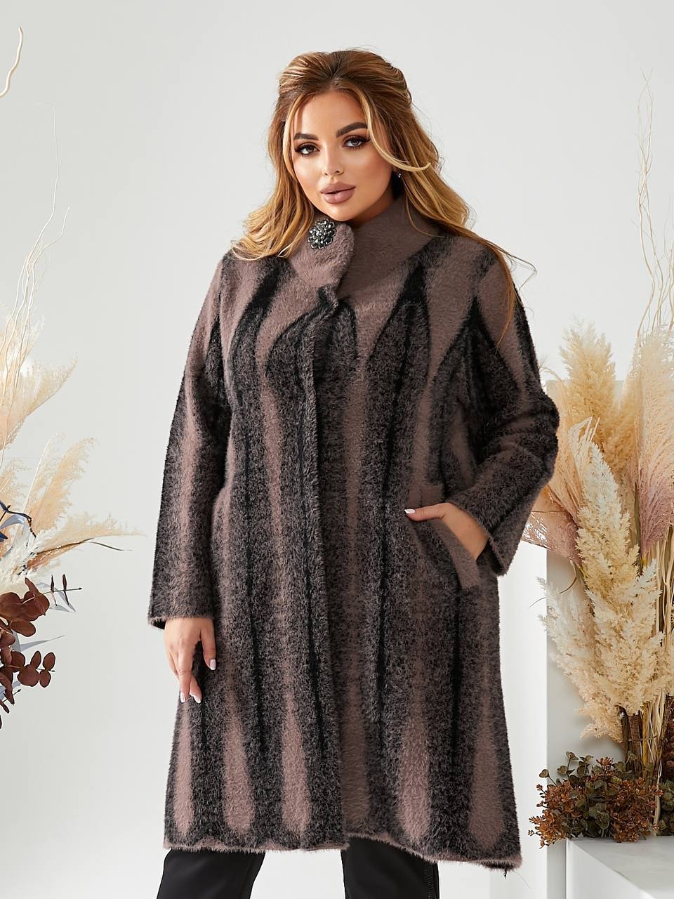 Стильне жіноче пальто з альпаки виглядає вишукано та благородно завдяки фактурній тканині й вертикальному візерунку, який візуально витягує силует та додає стрункості. Модель має вільний, комфортний крій, що ідеально підходить для пишних форм, не облягає та забезпечує максимальну зручність у носінні. Оздоблено красивою брошкою. Довжина пальта становить 100 см, що добре захищає від холоду та робить образ елегантним і завершеним. рукав довжиною 60 см від плечового шва забезпечує комфортну посадку без сковування рухів. М’яка альпака приємна на дотик, добре зберігає тепло та виглядає дорого, а кольорова гама у відтінках баклажан і коричневий робить модель універсальною для щоденних і більш елегантних образів. Пальто представлене у розмірах 52–58 та стане ідеальним вибором для тих, хто цінує комфорт, стиль і впевненість у кожній деталі.