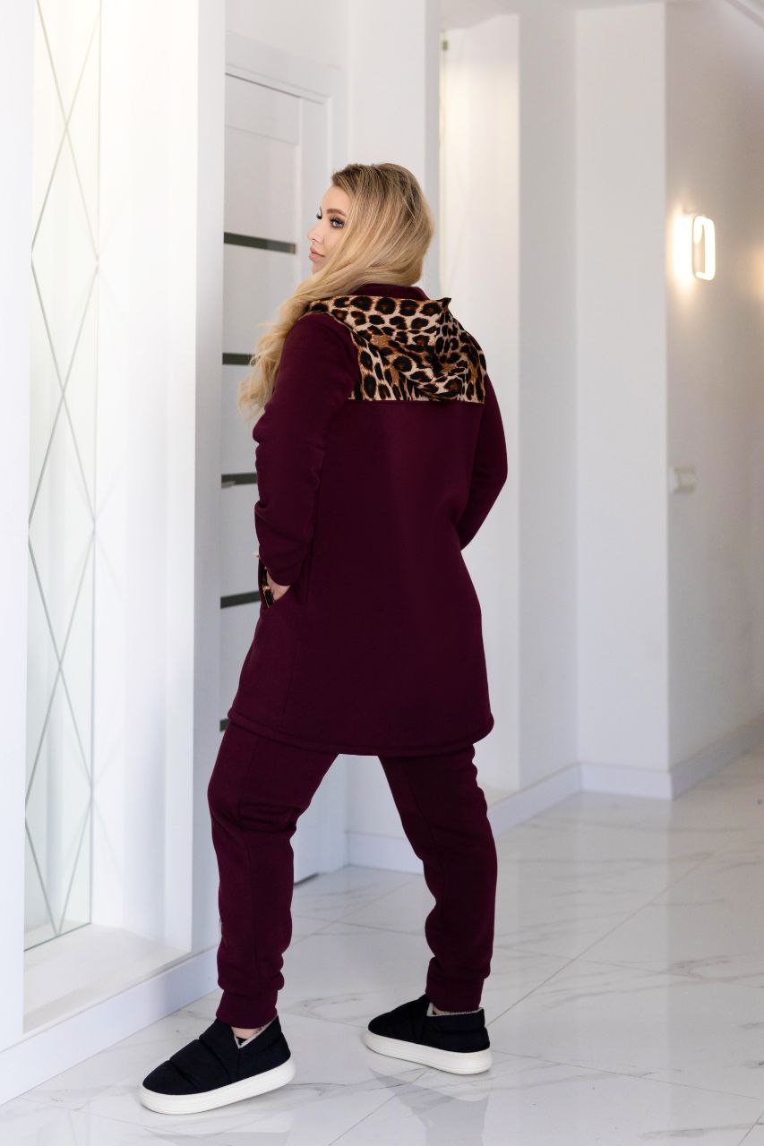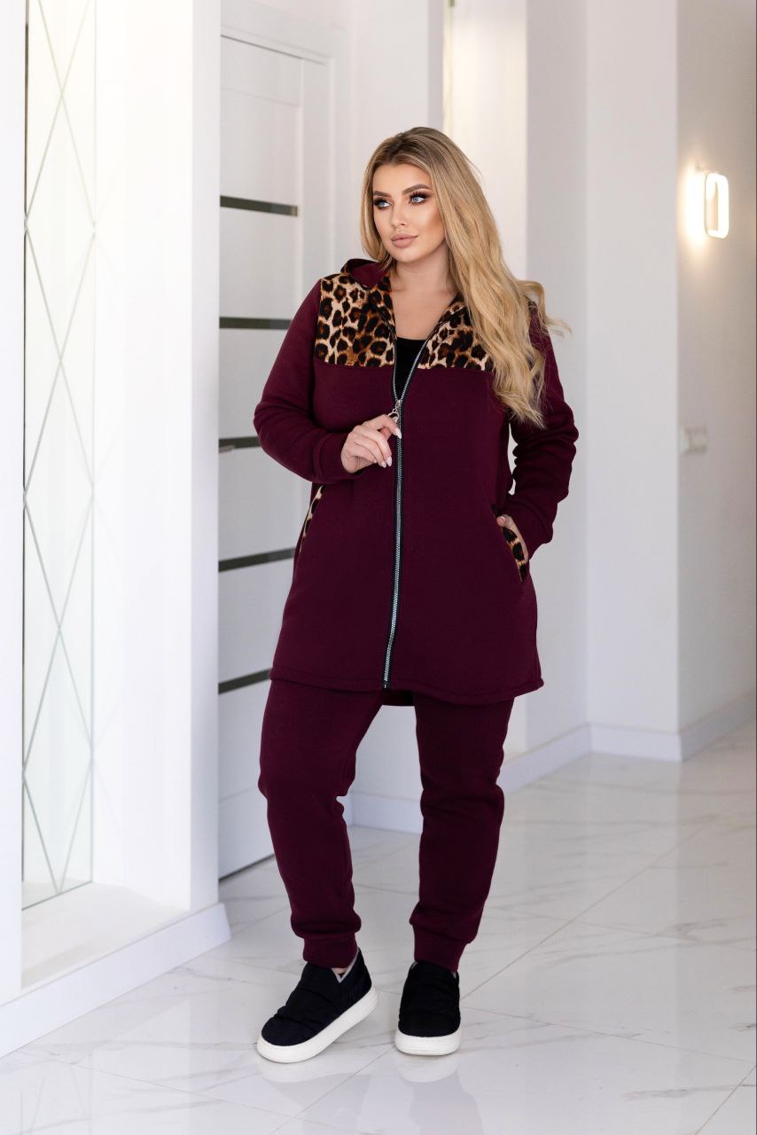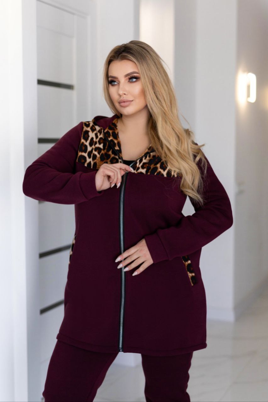 Додаткові характеристики: Теплий, гарний, якісний, костюм для прогулянки так і для повсякденного носіння, відмінний варіант хто хоче виглядати свіжо і яскраво. Зручний костюм зі вставками з леопарда, кардиган продовжений має кишені з капюшоном для зручності має змійку. Штани на манжеті з кишенями ,пояс прошитий на поясній машинці На моделі 52-54 розмір Параметри моделі: Обхват грудей – 115 см Обхват талії – 89 см Обхват стегон – 119 см Зріст моделі – 170 см