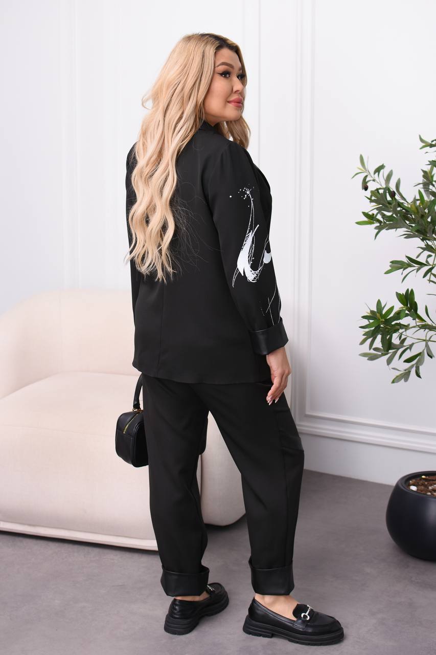 Стильний костюм-двійка – поєднання елегантності, характеру та сучасних трендів. Модель виглядає ефектно завдяки контрасту фактур: щільна креп-костюмка гарно тримає форму, а вставки з еко-шкіри додають образу виразності та стильного акценту. Жакет застібається на ґудзик, має акуратні плечики, що формують чіткий силует і підкреслюють лінію плечей. По низу рукавів – шкіряні вставки, які можна стильно підвернути для більш розслабленого вигляду. Декоративний накат на рукаві та грудях додає індивідуальності, а з боків розташовані робочі кишені з еко-шкіри – практичні та водночас акцентні. Штани з високою посадкою красиво підкреслюють талію та забезпечують комфорт завдяки поясу на резинці. З боків – зручні кишені. Дизайн доповнений шкіряною вставкою на одному коліні та стильним накатом на іншій штанині. Параметри моделі: зріст 165 см, на моделі представлений розмір 50-52.