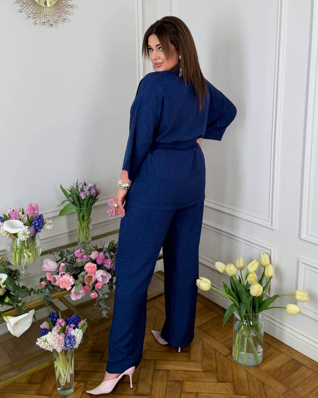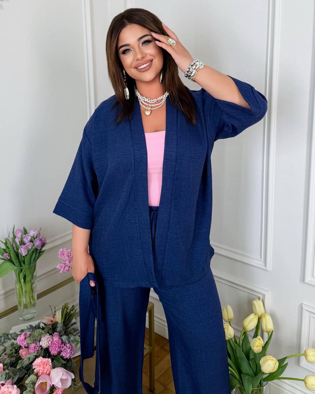 Стильний прогулянковий костюм зі льону «Бохо» – ідеальне поєднання легкості, комфорту та сучасної елегантності. Комплект складається з вільного кардигана під пояс і широких штанів, які створюють витончений та невимушений силует. Кардиган красиво лягає по фігурі, підкреслюючи талію, а штани з високою посадкою на гумці забезпечують комфортну посадку та свободу рухів. Модель доповнена кишенями у бічних швах і куліскою на поясі для ще більшої зручності. Літня тканина льон «Бохо» м’яка, приємна до тіла, не просвічується та чудово підходить для теплої пори року. Кольори: чорний, шоколадний, синій, пляшка, сірий. На моделях розмір 54-56, посадка вільна.