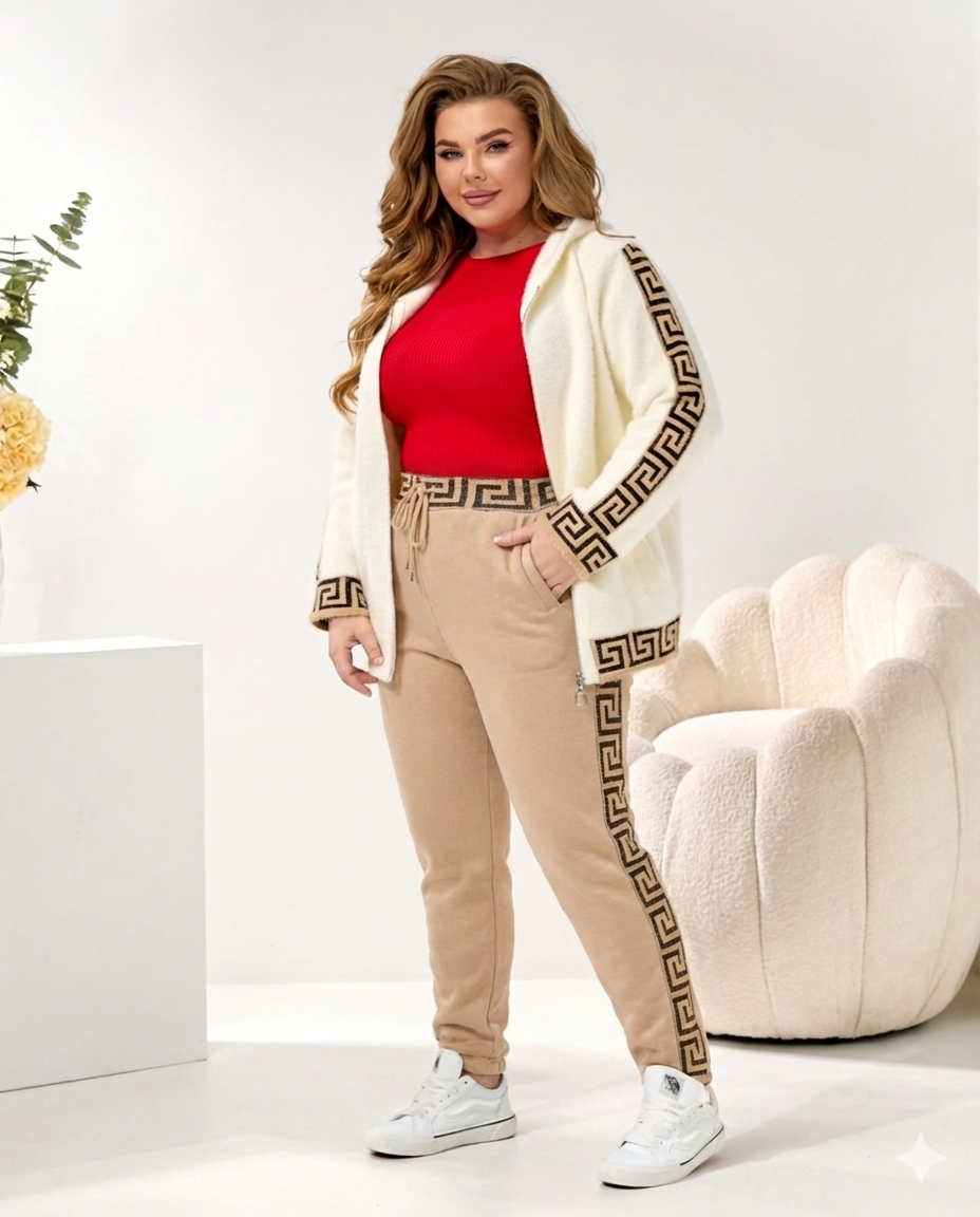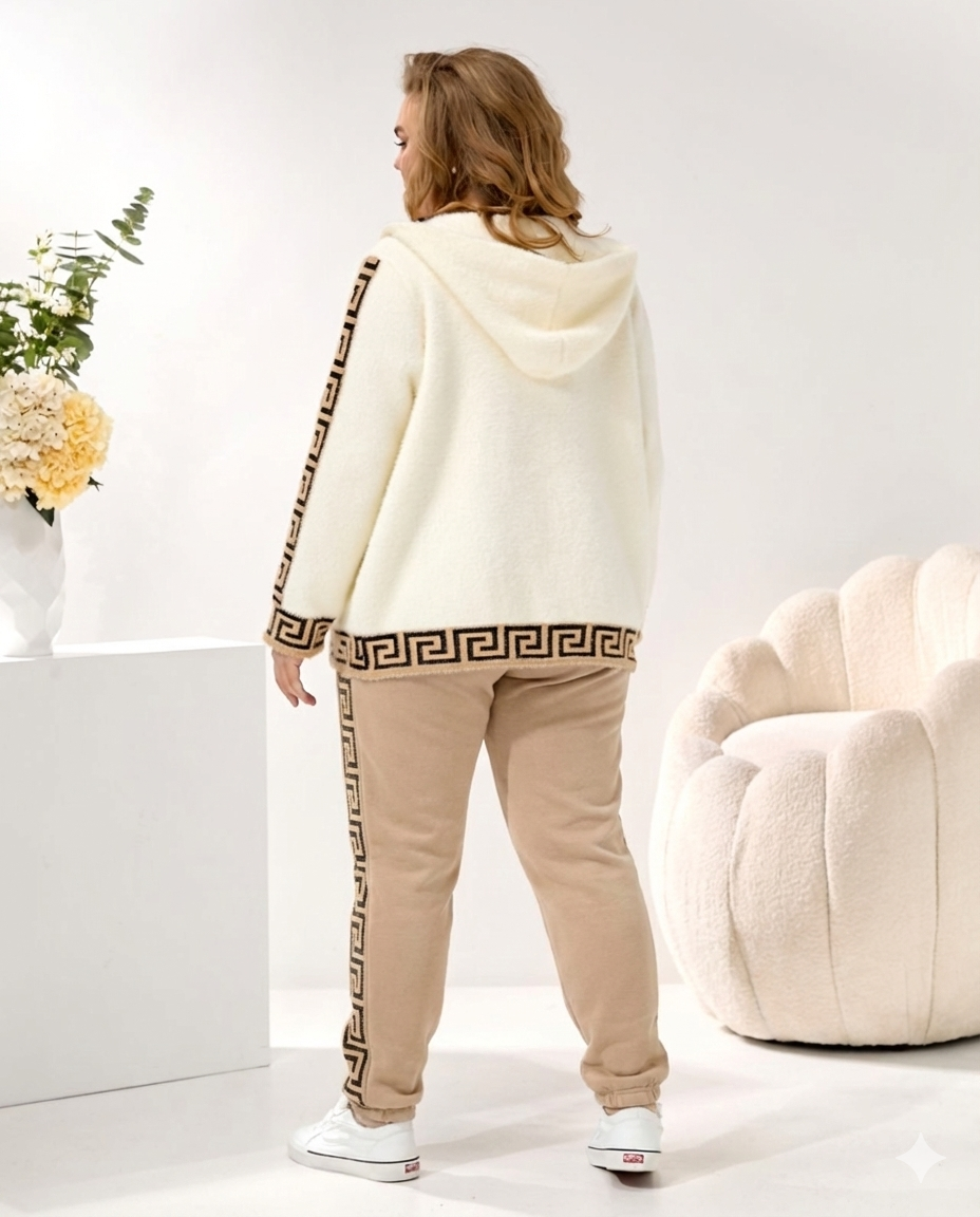 Елегантний костюм з альпаки — стильне рішення для комфортних та сучасних образів. Модель виготовлена з м’якої й теплої тканини альпака, яка приємна до тіла та добре зберігає тепло. Білий верх надає образу свіжості та легкості, а бежеві штани створюють гармонійний і вишуканий контраст. Декоративний візерунок уздовж рукавів і по боковому шву штанів додає костюму оригінальності та підкреслює силует. Продуманий крій забезпечує зручну посадку та свободу рухів, що робить модель ідеальною для щоденного носіння, прогулянок або подорожей. Костюм легко поєднується з базовим взуттям і аксесуарами, створюючи стильний, затишний і водночас елегантний образ для прохолодної пори року.