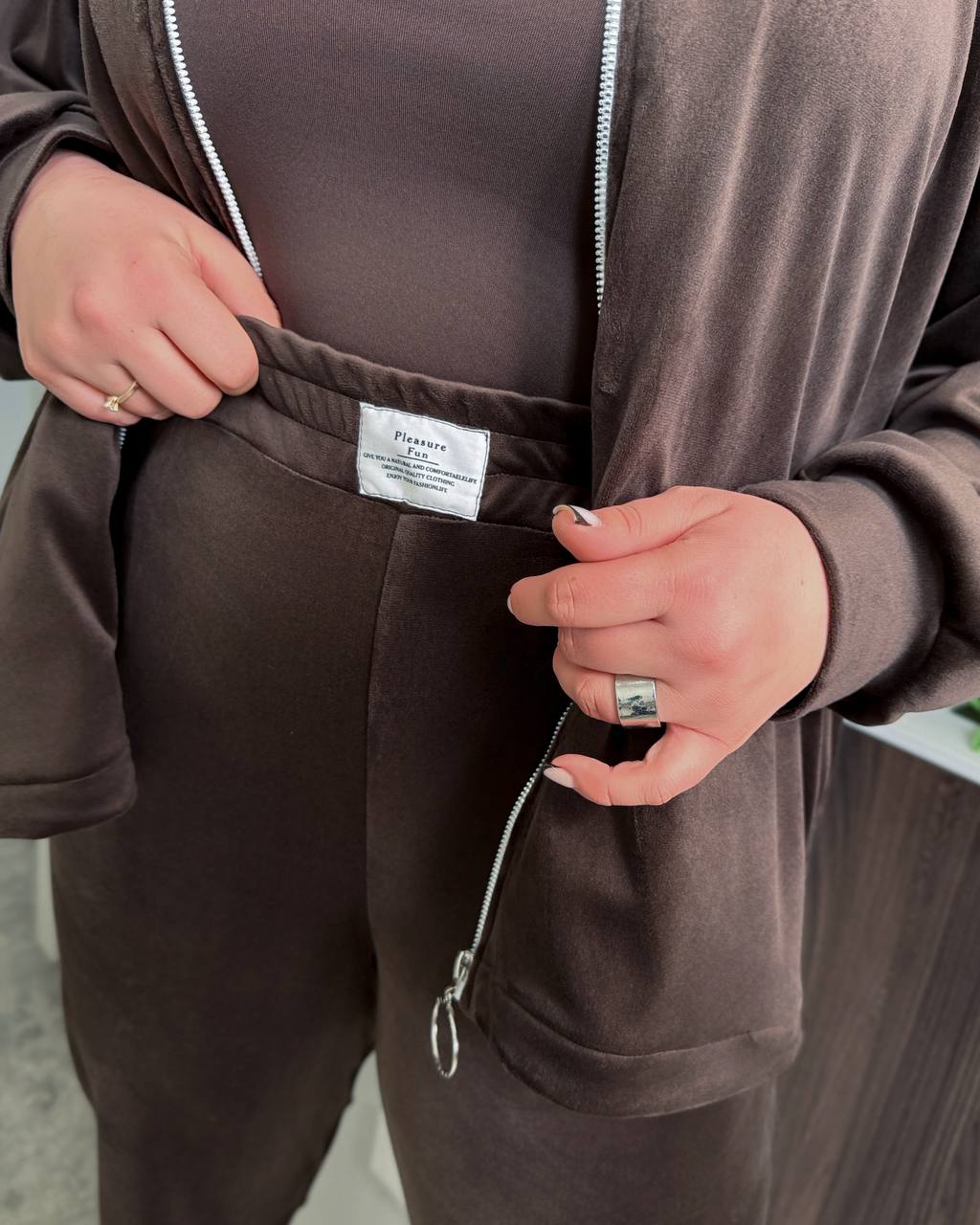 Стильний велюровий костюм – ідеальне поєднання комфорту, сучасного дизайну та жіночної елегантності у повсякденному образі. М’який якісний велюр приємний до тіла, має гарну розтяжність і красиво лягає по фігурі, забезпечуючи максимальний комфорт протягом усього дня. Кофта на змійці доповнена зручними кишенями та фіксатором з утяжкою по низу, що дозволяє регулювати посадку й створювати більш об’ємний або акуратний силует. Джогери з високою посадкою підкреслюють талію, комфортно сідають по фігурі та мають практичні кишені, роблячи модель ідеальною для активного ритму життя. Костюм виглядає стильно як у спортивних, так і в casual образах, легко поєднується з кросівками або базовим верхнім одягом. Представлений у трендових відтінках: чорний, графіт, моко, шоколадний та молочний – універсальні кольори для щоденного гардероба.