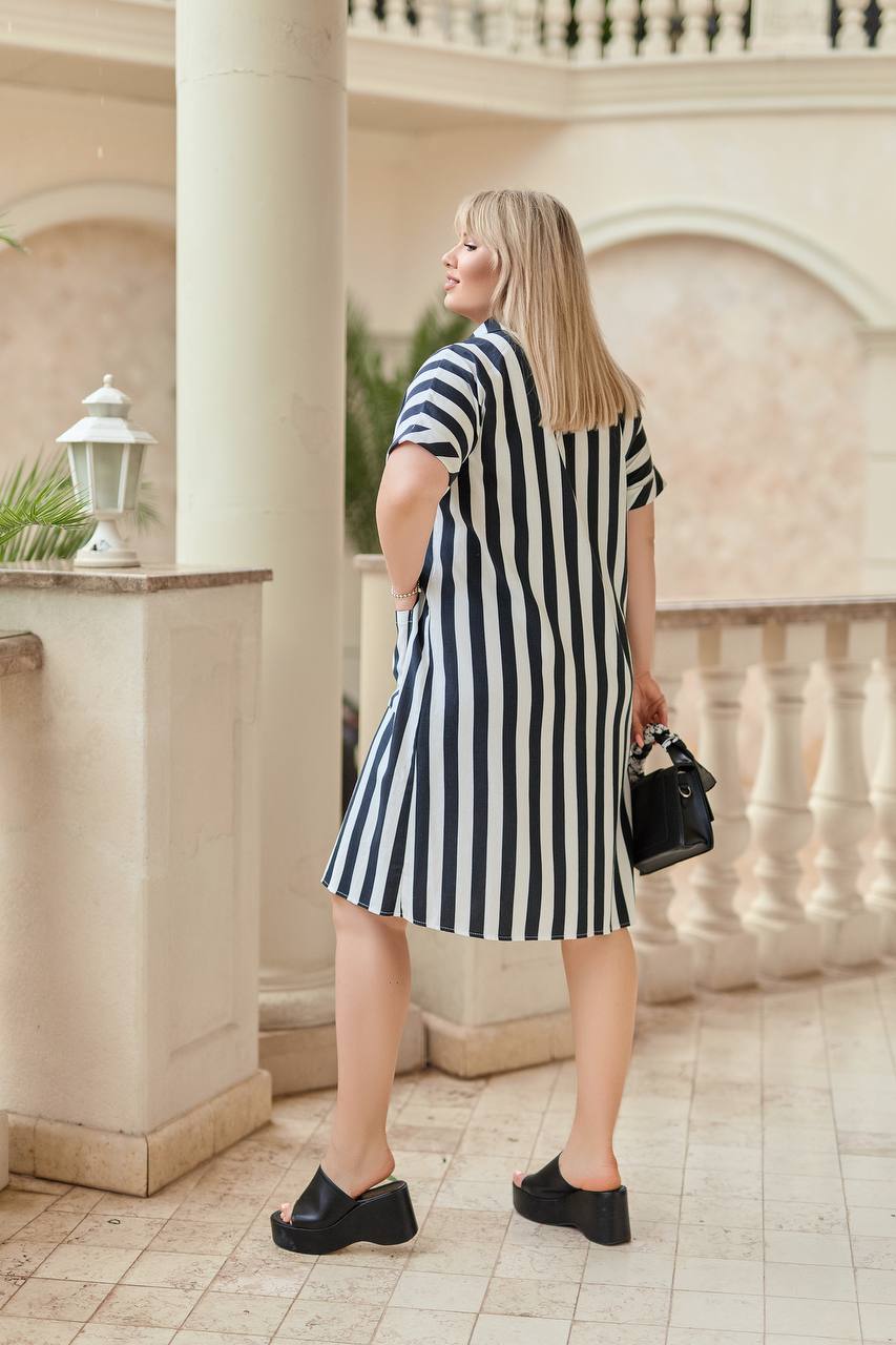 Додаткові характеристики: Повсякденне ніжне жіноче плаття-сорочка з лляної тканини в смужку. Універсальний фасон і натуральний матеріал забезпечують комфорт та роблять плаття ідеальним як для щоденних образів, так і для створення вишуканого, свіжого стилю. Вона вдало підкреслює природну красу та додає легкості зовнішньому вигляду.