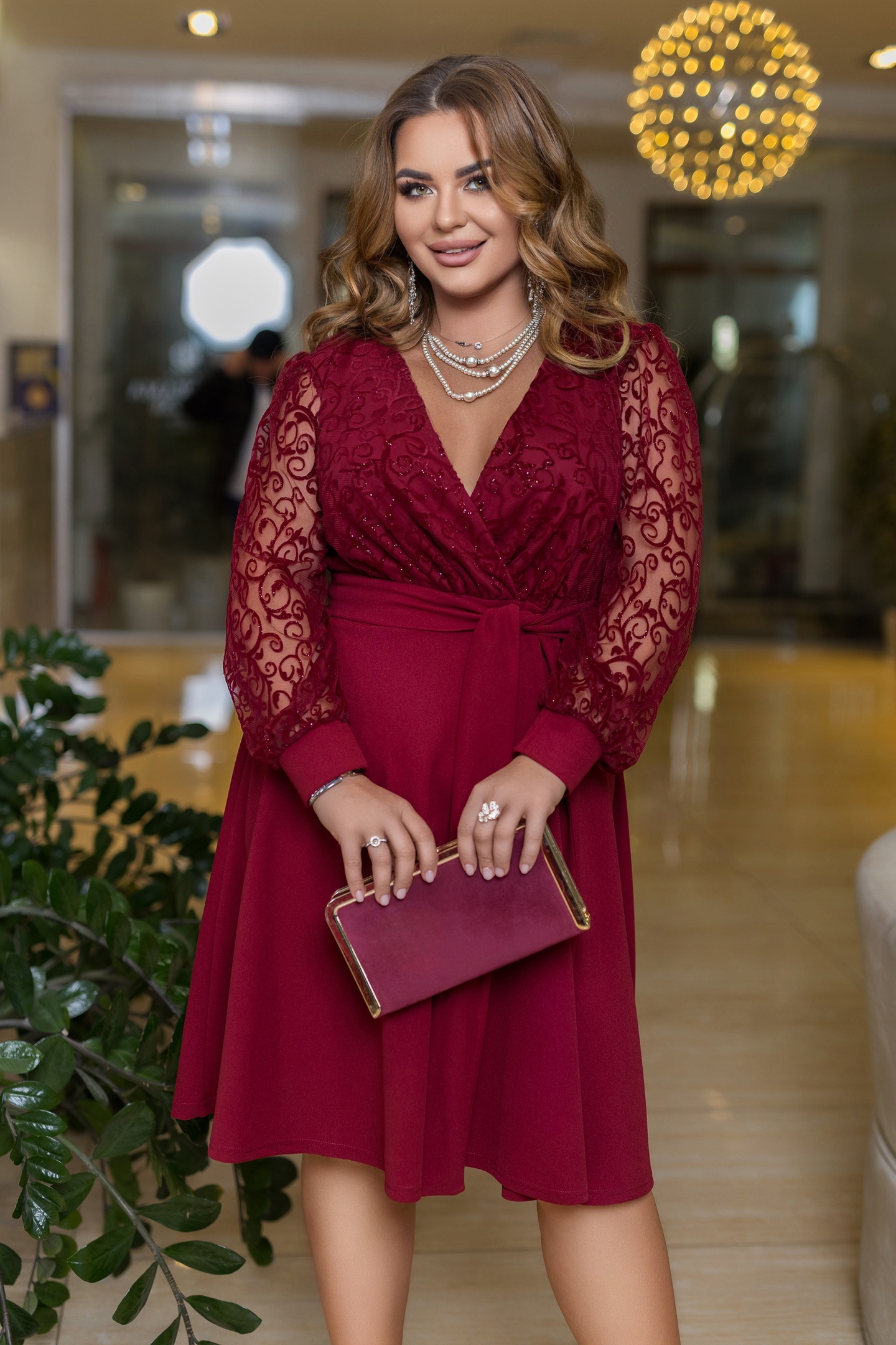 Додаткові характеристики: Елегантне жіноче плаття, виконане з кріп дайвінгу (тягнеться) і сітки з блиском. Перед сукні з імітацією запаху. До сукні додається знімний пояс із основної тканини. У такій сукні будь-яка жінка зможе відчути себе справжньої леді та королевою вечора, ця сукня здатна надати жінці ніжності, легкості та елегантності. На моделі одягнений 50-52 розмір. Параметри моделі на момент зйомки: ОГ: 110 см. ОТ: 93 см ОБ: 120 см.