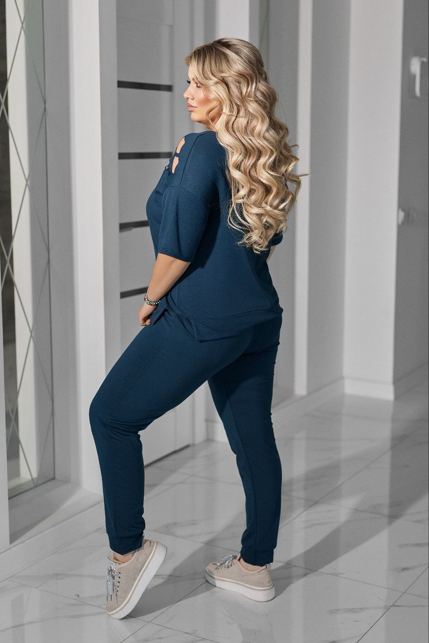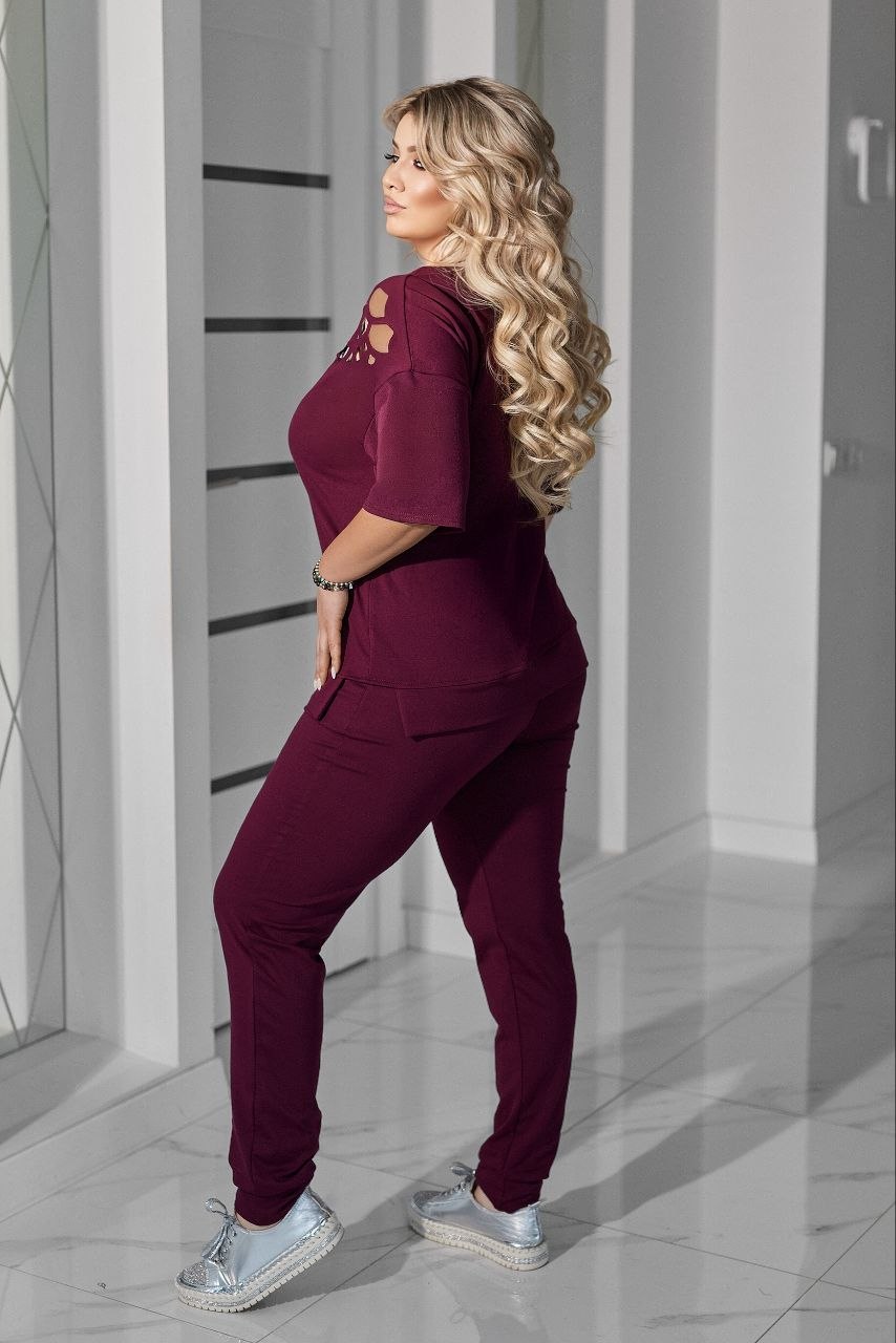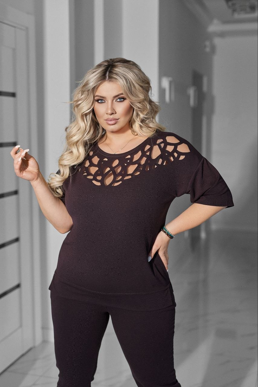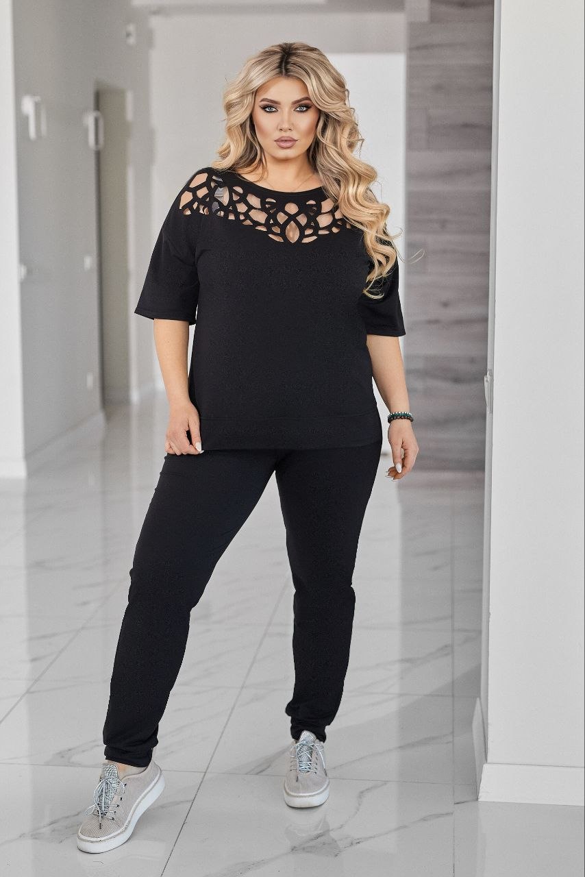Стильний костюм з жіночним акцентом та ефектними деталями, що вдало поєднує комфорт і елегантність. Кофта напіввільного крою – гарно сідає по фігурі, не обтягує та забезпечує свободу рухів. Головна родзинка моделі – витончена лазерна різка по горловині, яка виглядає стильно та привертає увагу. Рукав 3/4 додає універсальності, а манжет по низу кофти акуратно фіксує форму. Штани звужені донизу – візуально витягують силует, по низу мають манжети для комфортної посадки. Є зручні кишені, а пояс на резинці, прострочений на спеціальному обладнанні, не перекручується та добре тримається. Тканина – якісна двухнитка, м’яка та приємна до тіла, добре зберігає форму і комфортна у носінні протягом усього дня. Костюм ідеально підходить як для повсякденних образів, так і для більш стильних виходів. Зріст моделі 170 см, на моделі розмір 52-54.