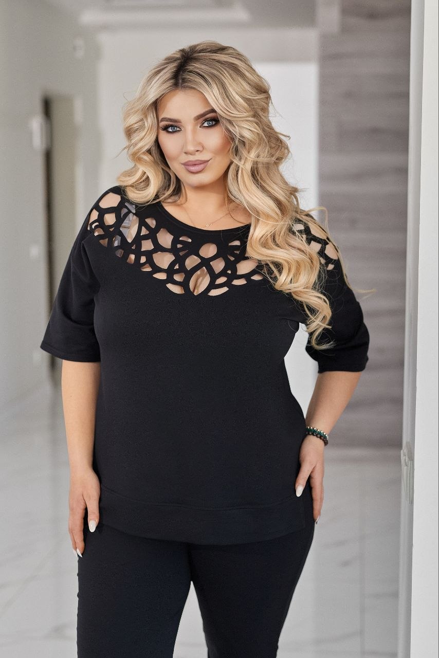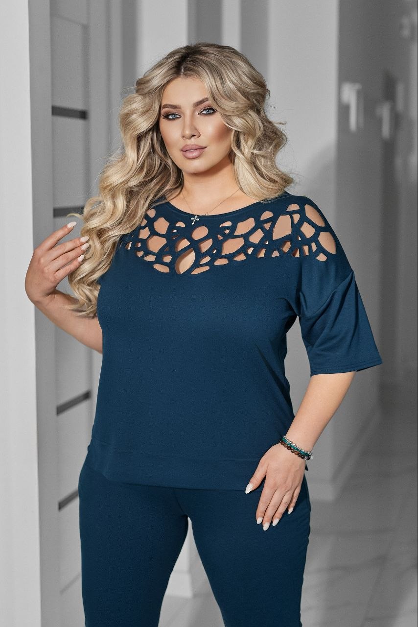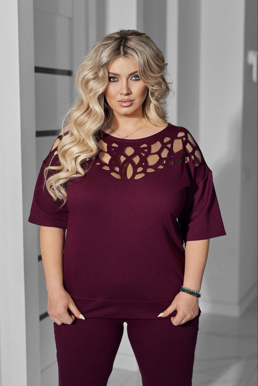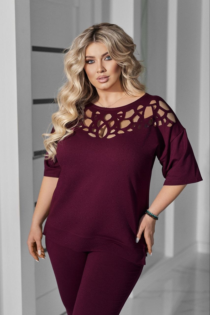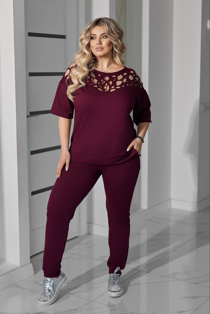 Стильний костюм з жіночним акцентом та ефектними деталями, що вдало поєднує комфорт і елегантність. Кофта напіввільного крою – гарно сідає по фігурі, не обтягує та забезпечує свободу рухів. Головна родзинка моделі – витончена лазерна різка по горловині, яка виглядає стильно та привертає увагу. Рукав 3/4 додає універсальності, а манжет по низу кофти акуратно фіксує форму. Штани звужені донизу – візуально витягують силует, по низу мають манжети для комфортної посадки. Є зручні кишені, а пояс на резинці, прострочений на спеціальному обладнанні, не перекручується та добре тримається. Тканина – якісна двухнитка, м’яка та приємна до тіла, добре зберігає форму і комфортна у носінні протягом усього дня. Костюм ідеально підходить як для повсякденних образів, так і для більш стильних виходів. Зріст моделі 170 см, на моделі розмір 52-54.